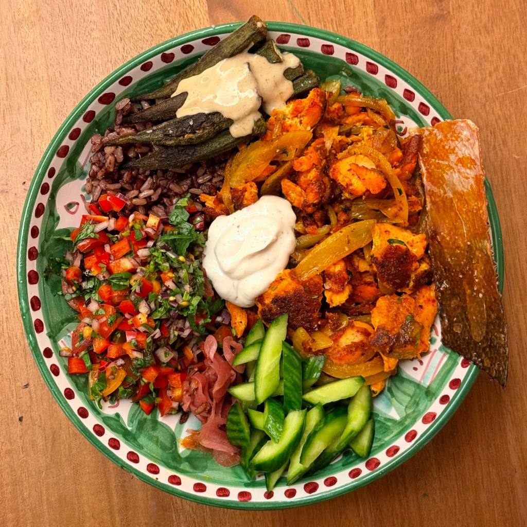 For the okra, coat with 1 teaspoon of avocado oil and bake.