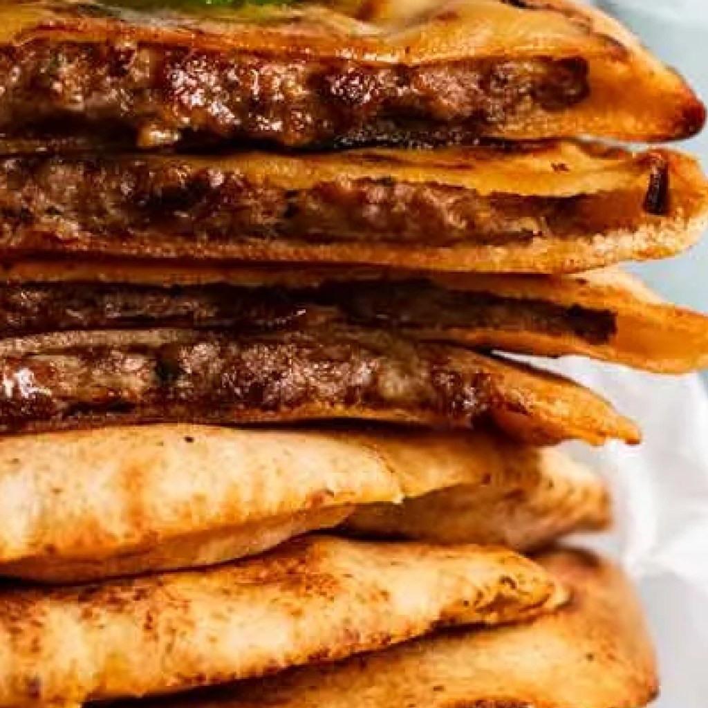 - Place a small amount of meat on top and spread it out into a half pancake.